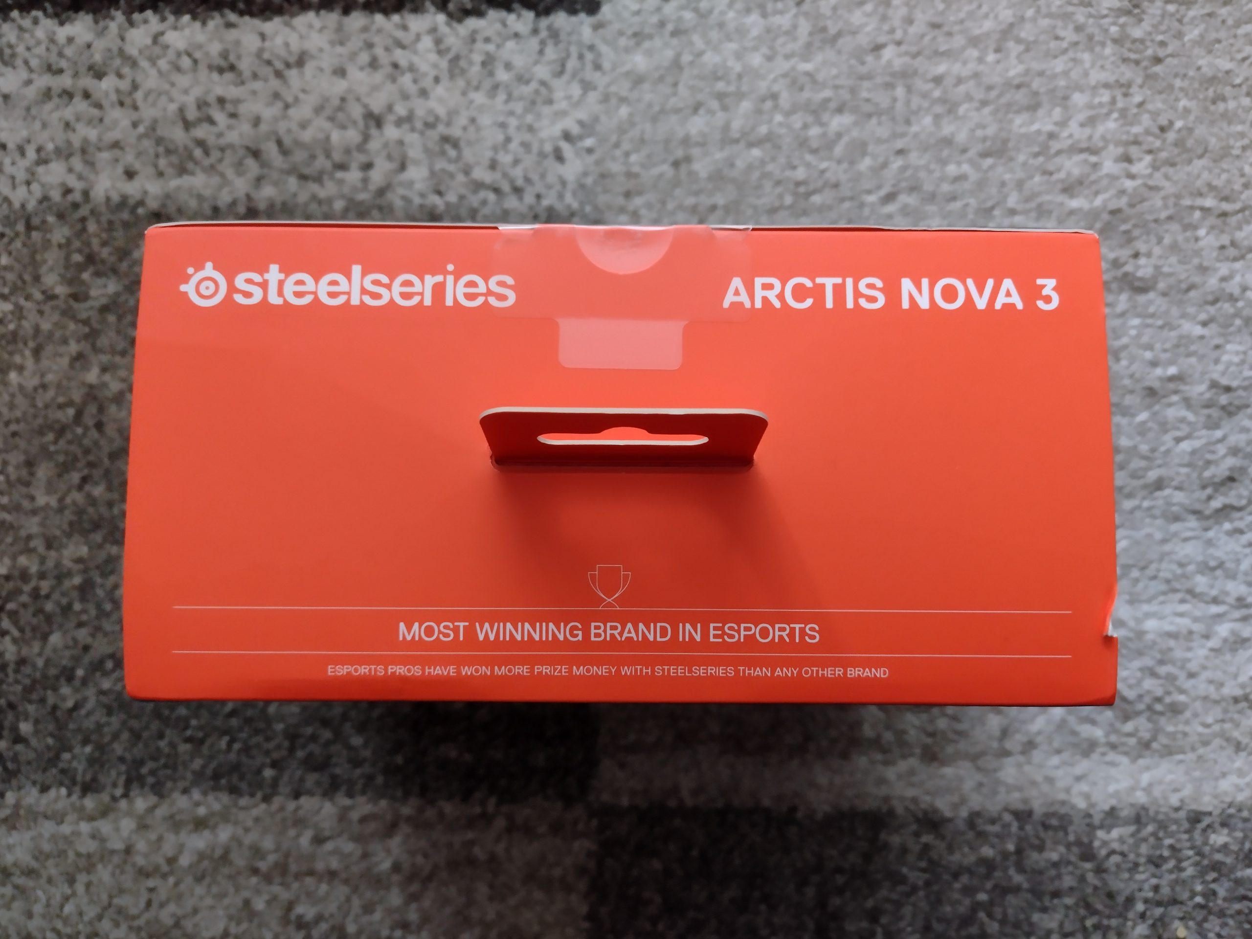 Na górze nie brakuje loga, napisu producenta i modelu. Ponadto marka z Danii dodała także następującą wzmiankę: “MOST WINNING BRAND IN ESPORTS. ESPORTS PROS HAVE WON MORE PRIZE MONEY WITH STEELSERIES THAN ANY OTHER BRAND”.