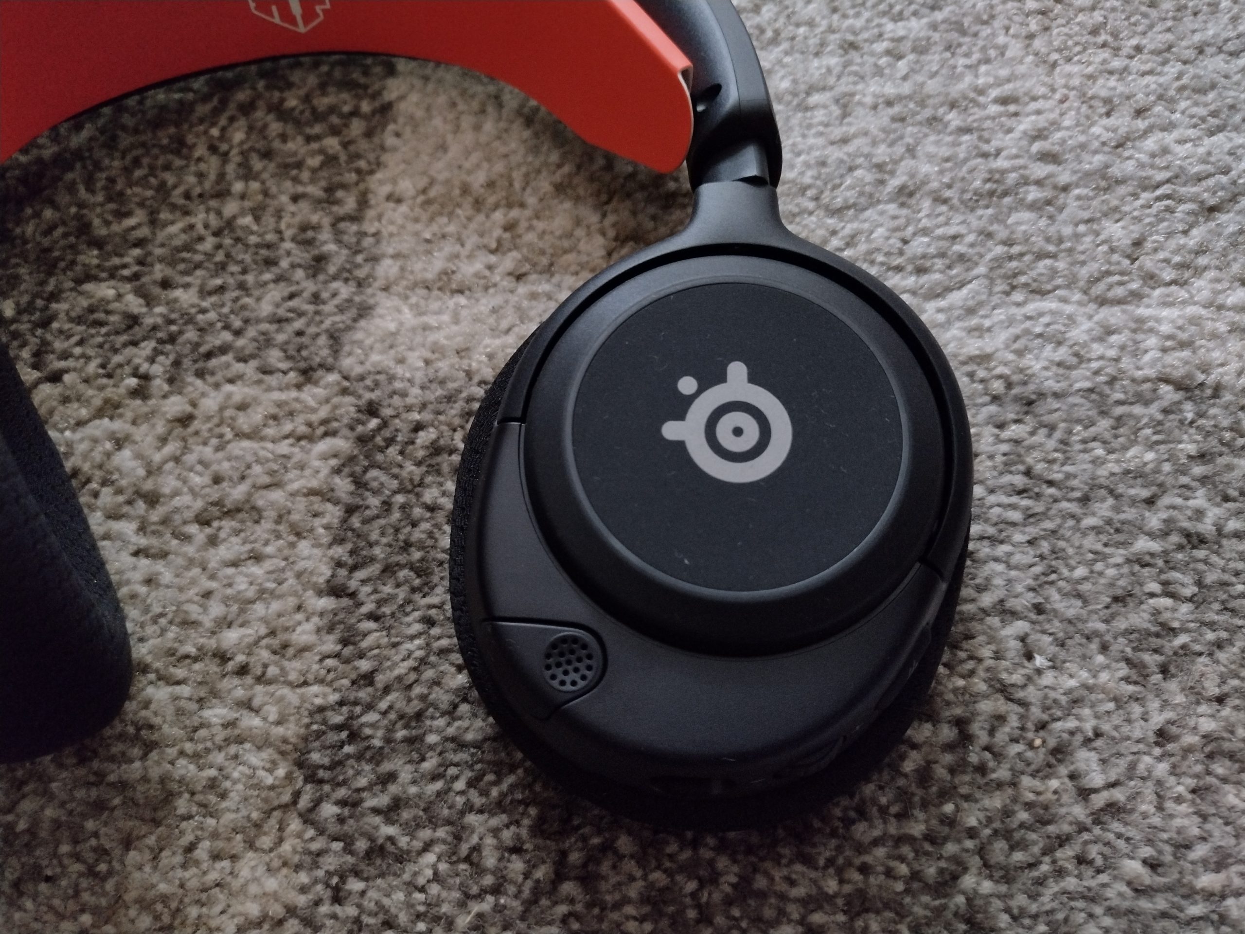 Zacznijmy jednak od lewej strony z zewnątrz. W centralnym punkcie nausznika jest logo producenta oraz chowany mikrofon. Wokół loga, zarówno na lewej, jak i prawej muszli mamy ringowe listwy podświetlenia. Obie muszle można śmiało obracać, tak więc nie powinno być ewentualnych problemów z precyzyjnym dopasowaniem do głowy. W kontekście lewej słuchawki to jeszcze nie wszystko, ponieważ mamy tu swego rodzaju centrum dowodzenia. Od dołu zastaniemy przycisk do wyciszania mikrofonu, pokrętło do regulacji głośności, a także złącze USB-C. Minusem w tym miejscu może okazać się brak drugiego złącza na jacka 3.5 mm. Jest także wysuwany mikrofon.