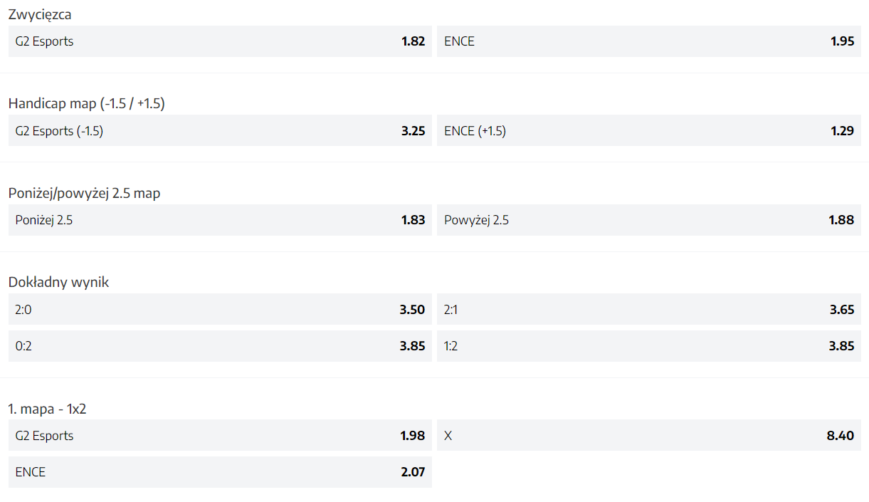 Niemałe nerwy czekają dziś kibiców z Polski, ponieważ przed ENCE bardzo trudny przeciwnik, jakim jest G2 Esports. Stawka tego meczu jest niemała, ponieważ chodzi tu o pozostanie w turnieju. Przegrana z kolei oznaczać będzie koniec zmagań. Tak więc trzeba zrobić wszystko i stanąć na wyżynach swoich umiejętności, by ten pojedynek wygrać. Czysto teoretycznie “Ośmiorniczki” nie powinny się mieć czym przejmować, ponieważ są wyżej w rankingu HLTV, a do tego wygrały 30 maja podczas IEM Dallas 2:0. Podobne kursy sugerują jednak, że wygrać dziś może każdy. Nieco niższy jest na ENCE, bo jest nim 1.82, podczas gdy na “Samurajów” jest to 1.95.