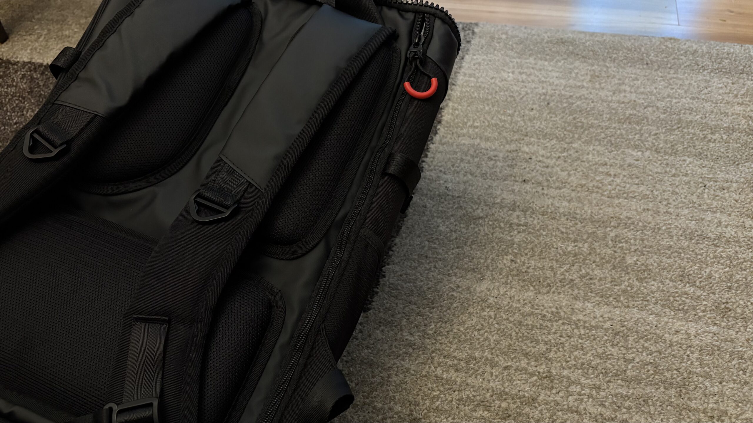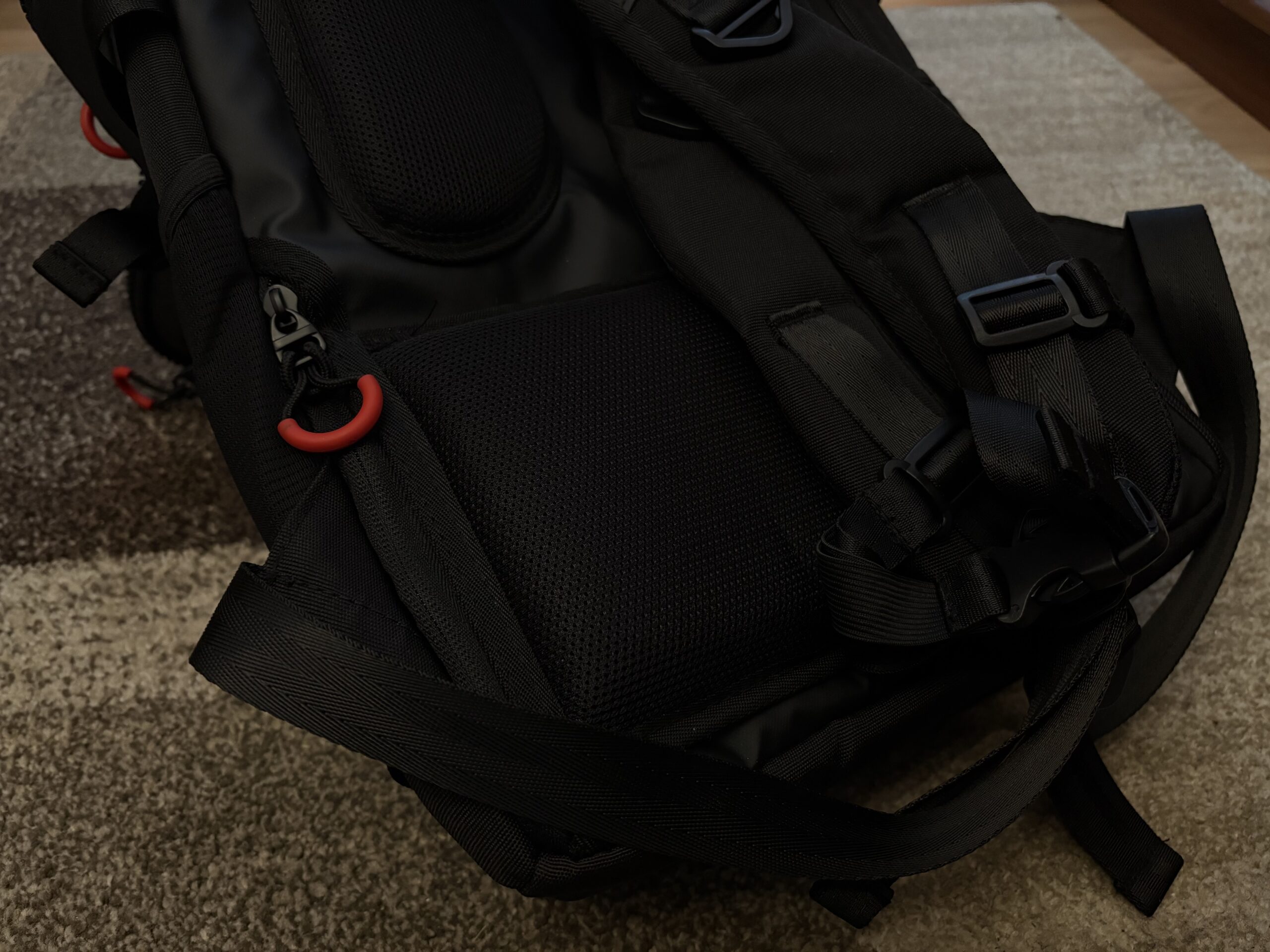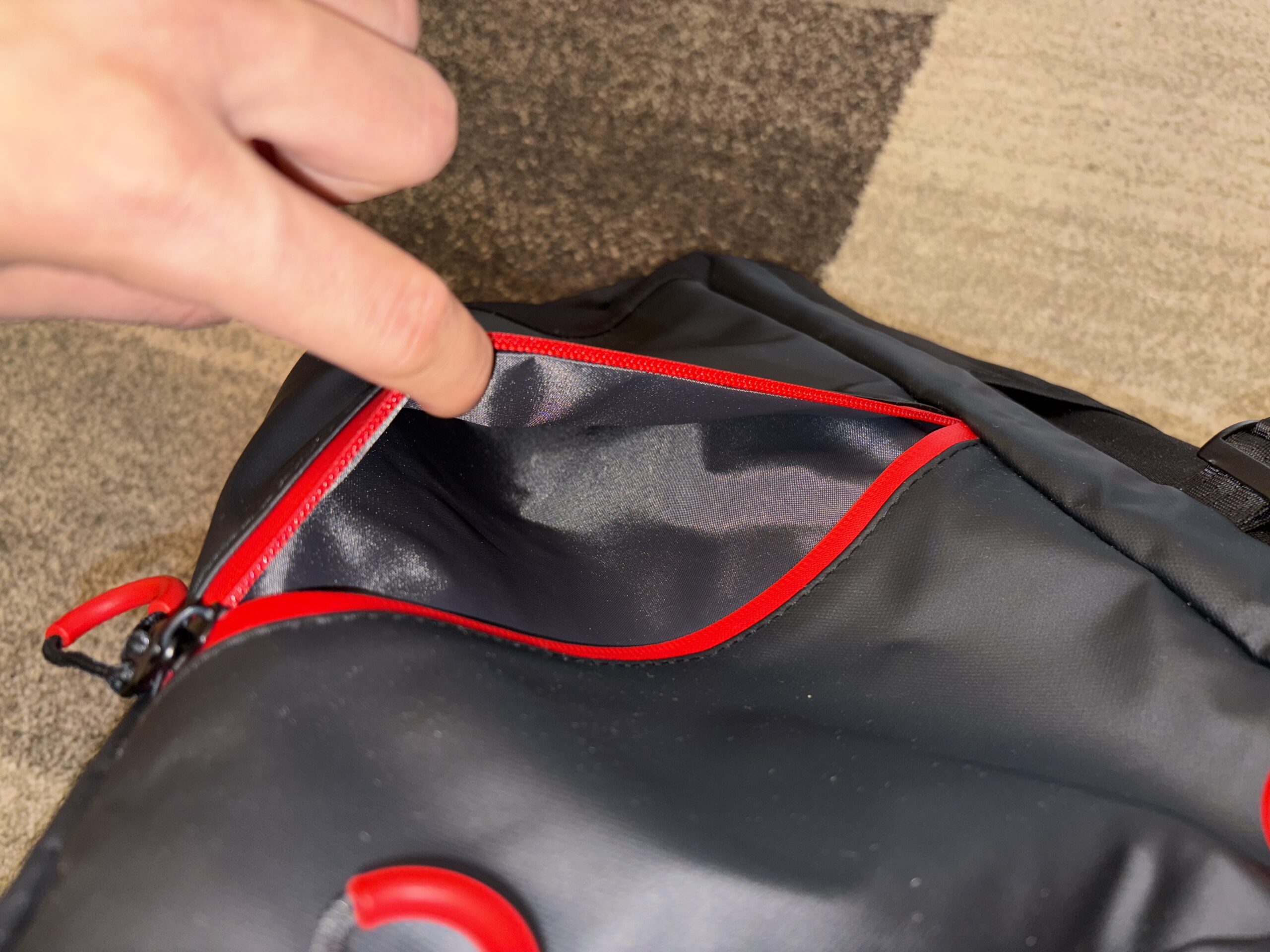 Producent popracował na odwrocie, wszak na dole, jak i po bokach zastosowano ergonomiczne wykończenie. Gąbki zostały pokryte siatką. Warto także odnieść się do samej dolnej części, która nie jest na stałe przytwierdzona, dzięki czemu plecak można zawiesić za rączkę od walizki. Tym razem po prawej stronie, na samym dole mieści się suwak o wysokości około 20 centymetrów. Uchyla on wrota do najbezpieczniejszej skrytki w całym plecaku, do której można włożyć chociażby dokumenty. Nie wiem jednak, czy rozwiązanie z zamkiem na górze nie byłoby zdecydowanie lepsze i pewniejsze. Jednak coś kosztem czegoś.