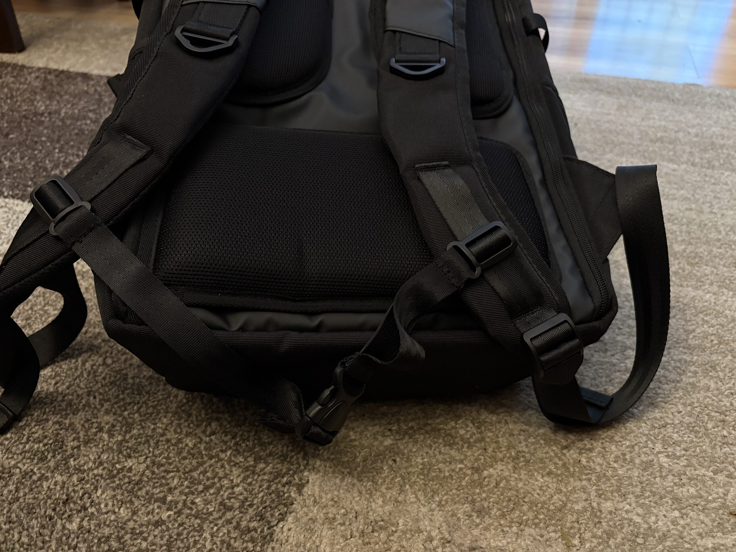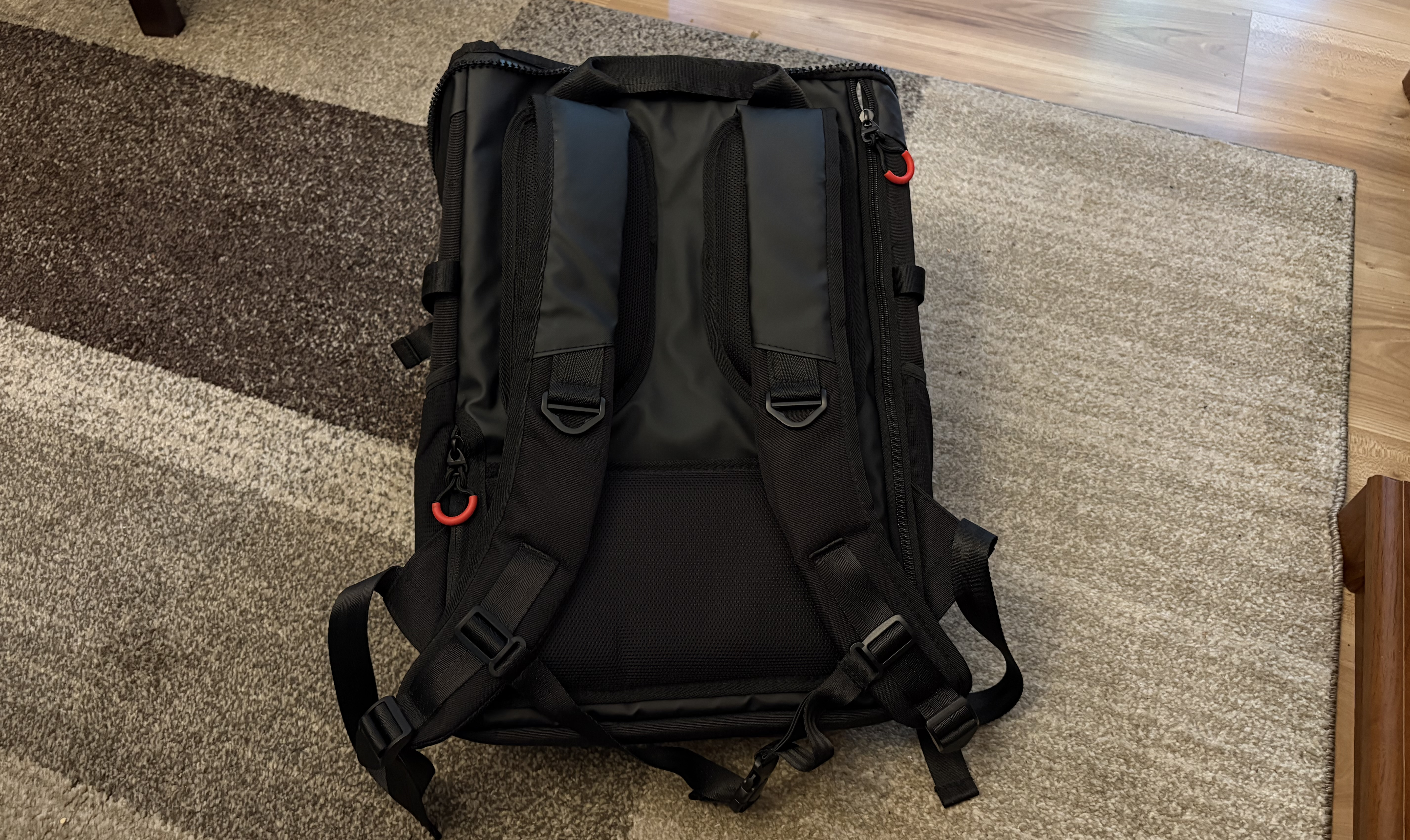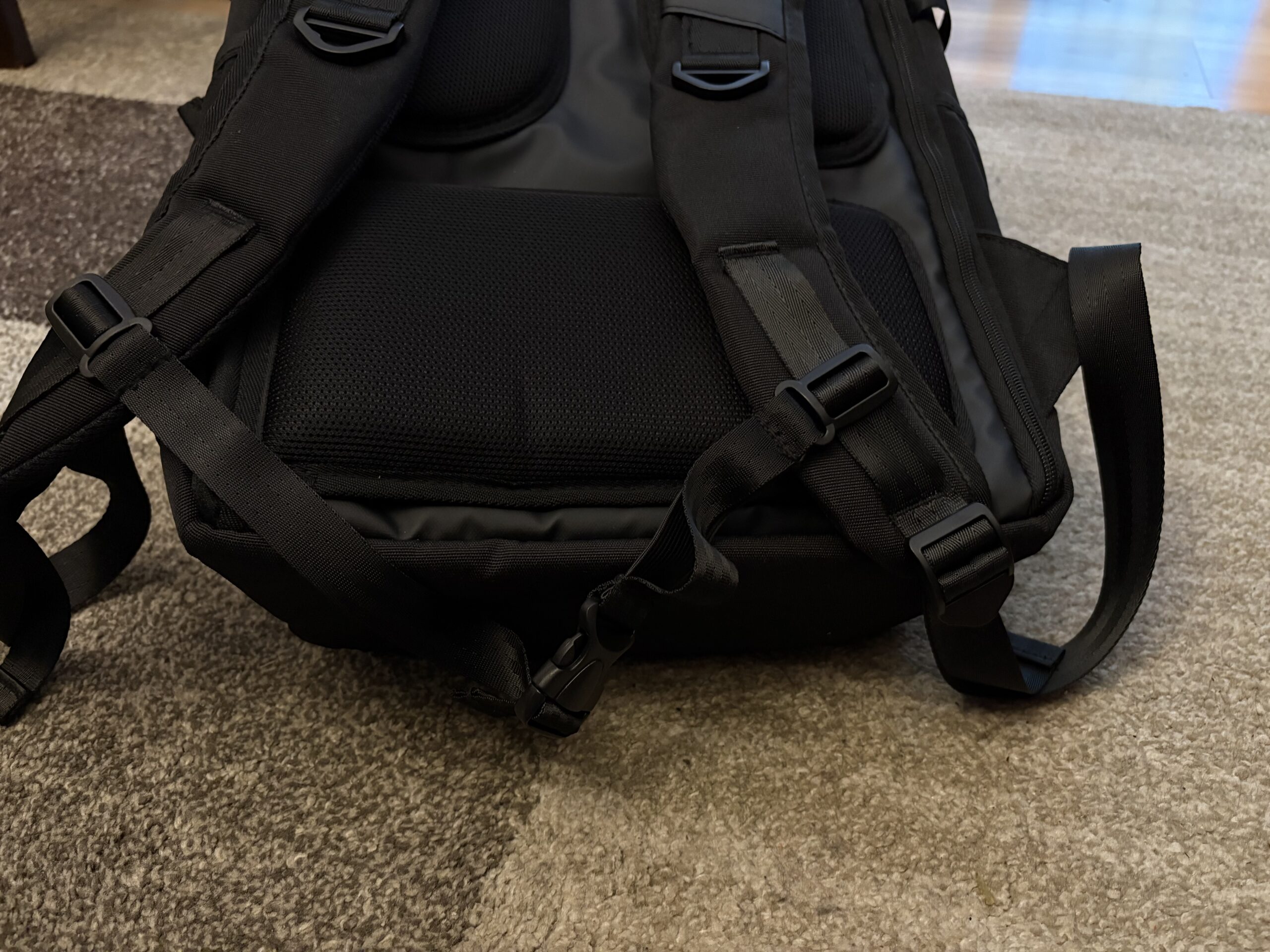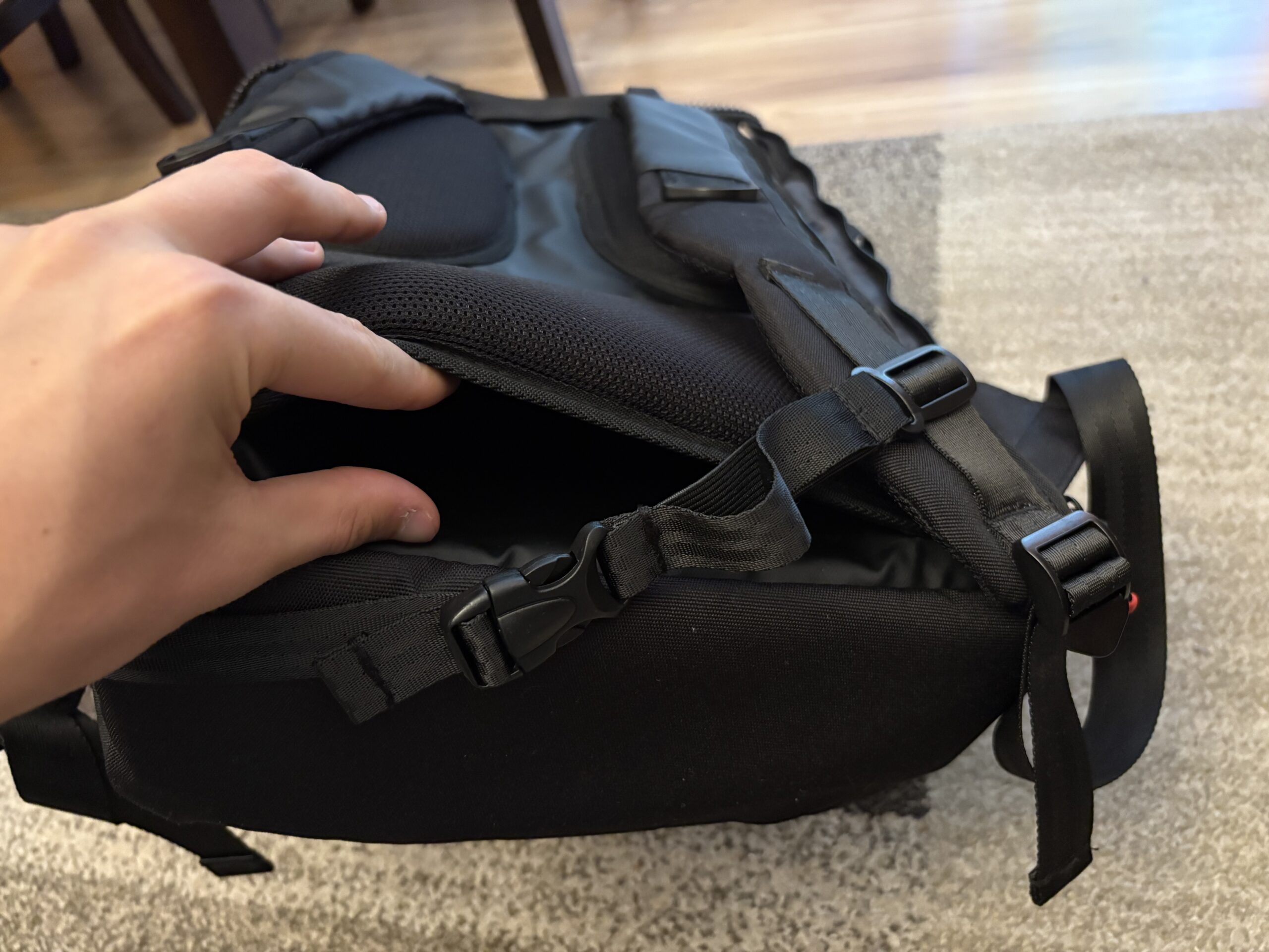 Producent popracował na odwrocie, wszak na dole, jak i po bokach zastosowano ergonomiczne wykończenie. Gąbki zostały pokryte siatką. Warto także odnieść się do samej dolnej części, która nie jest na stałe przytwierdzona, dzięki czemu plecak można zawiesić za rączkę od walizki. Tym razem po prawej stronie, na samym dole mieści się suwak o wysokości około 20 centymetrów. Uchyla on wrota do najbezpieczniejszej skrytki w całym plecaku, do której można włożyć chociażby dokumenty. Nie wiem jednak, czy rozwiązanie z zamkiem na górze nie byłoby zdecydowanie lepsze i pewniejsze. Jednak coś kosztem czegoś.