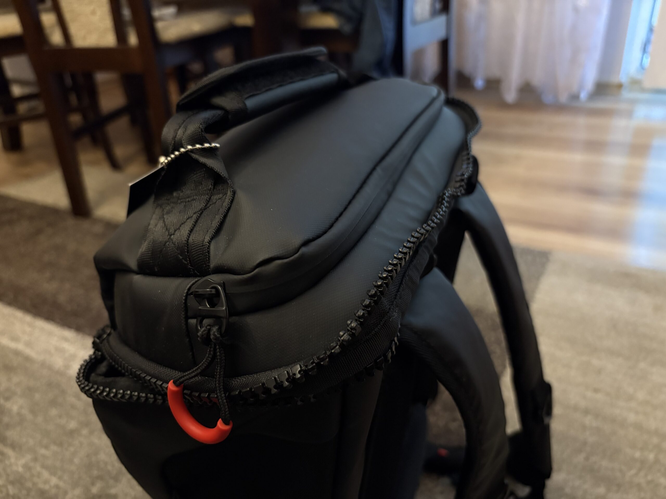 Szelki natomiast sprawiają wrażenie nieco delikatnych. Z zewnątrz zostały pokryte skórą ekologiczną. Część przylegająca do ciała to również wykończenie z siatki. Na dole szelek są nie tylko paski do standardowej regulacji, ale także te do talii, z który opcjonalnie można korzystać. To szczególnie przydatne rozwiązanie chociażby w trakcie górskich wędrówek (gdyby na takie Was z tym plecakiem naszło). Niemniej, dobrze sprawdza się również w zwykłym korzystaniu, zwłaszcza kiedy bag jest wypełniony i ciężki. Nad szelkami z kolei jest materiałowy uchwyt. Rączka znajduje się także na górnej pokrywie. Obok niej jest kolejna kieszonka, której trudno może być się dopatrzeć, gdyby nie fakt, że zdradza ją sam zasuwak. Wszystko za sprawą maskowanego zamka.