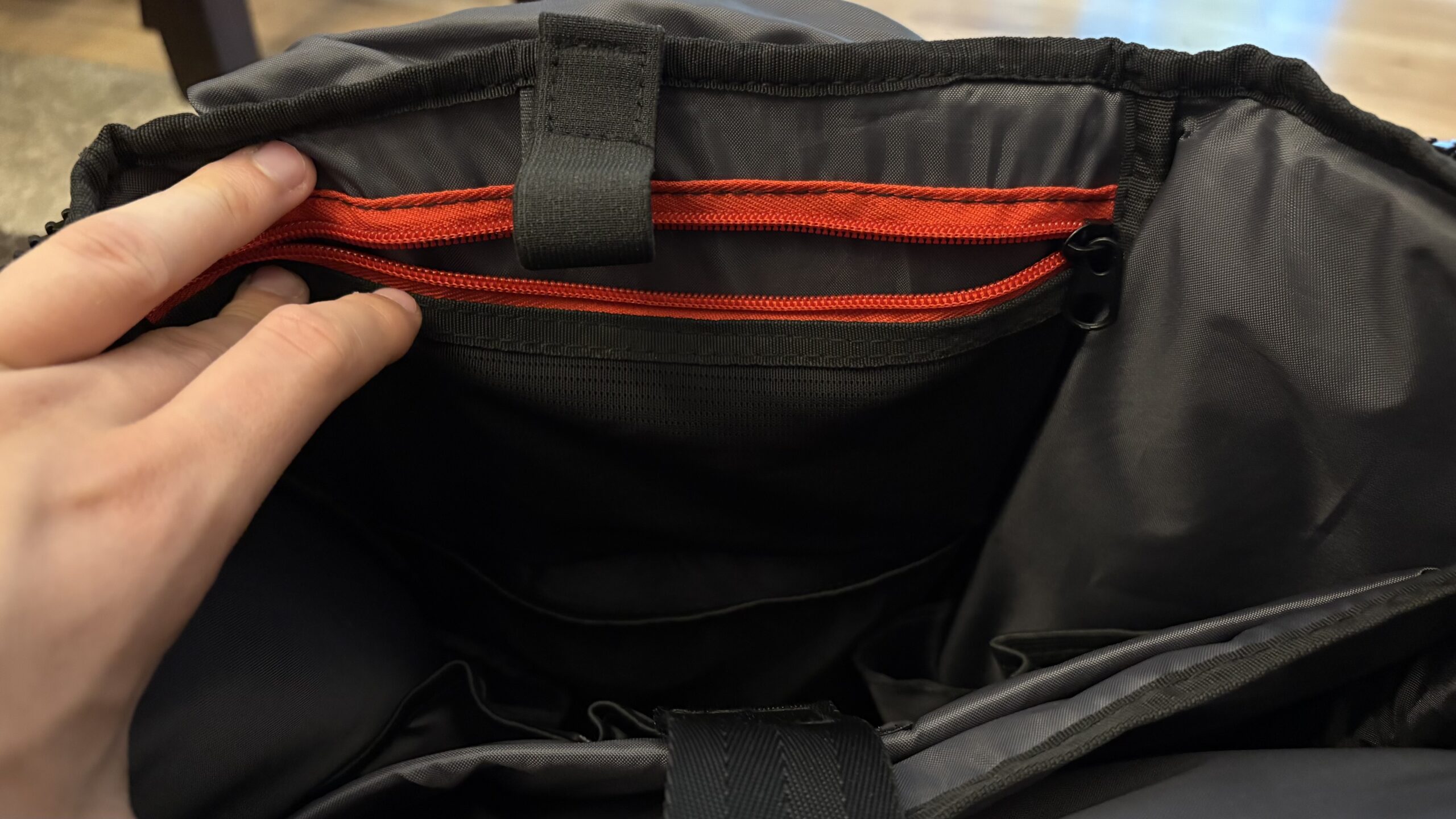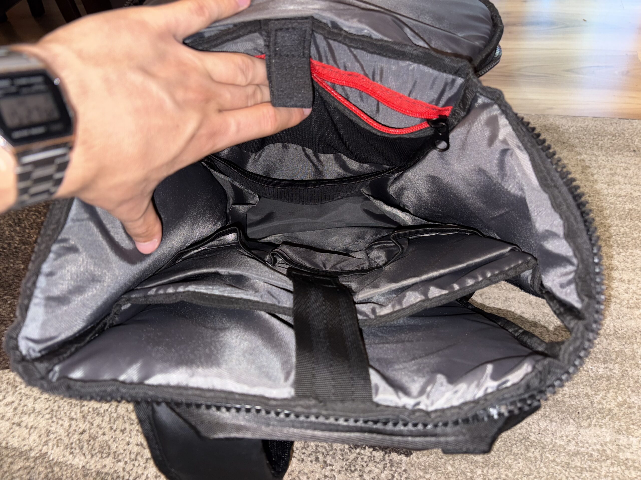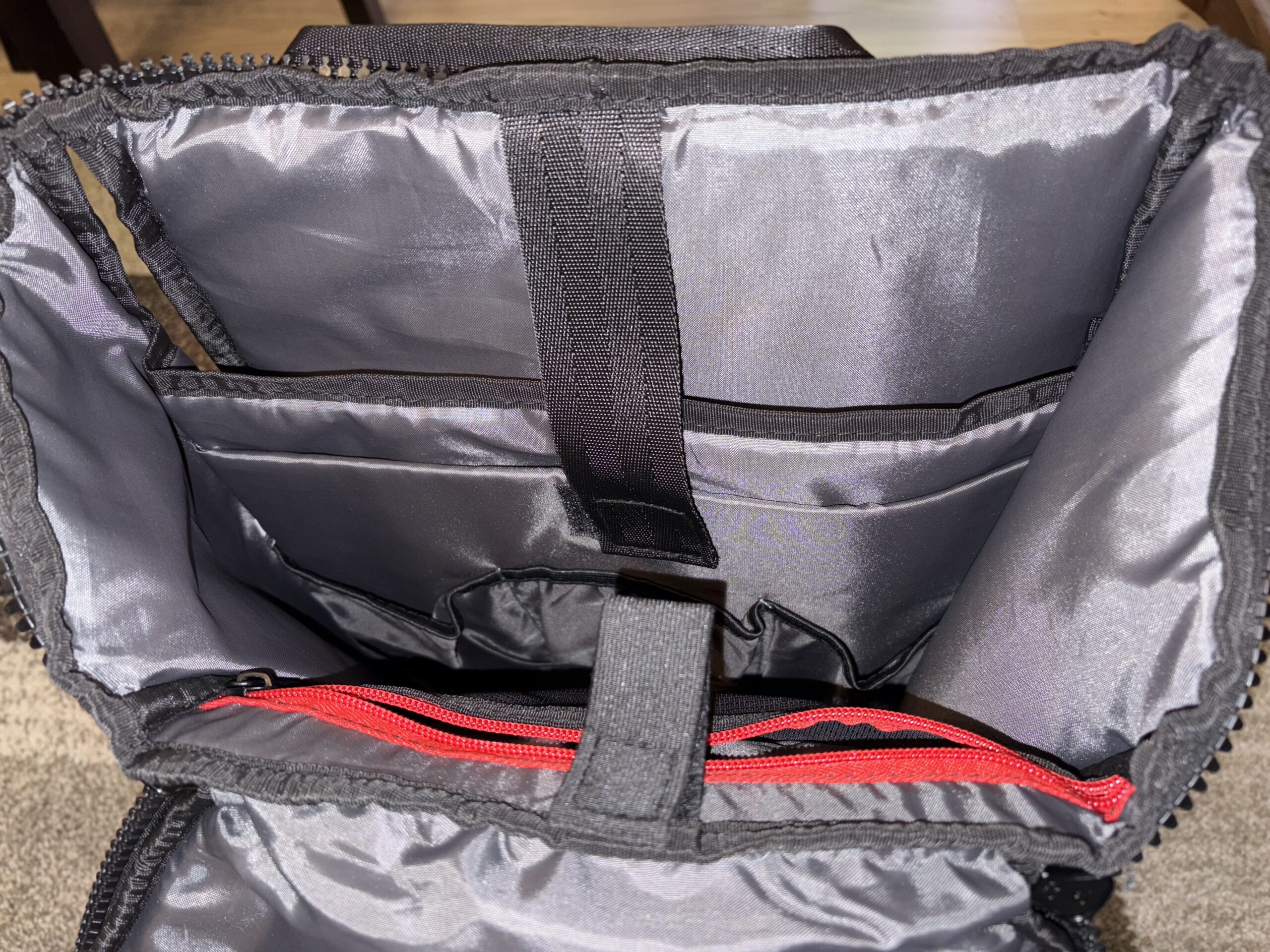 Równolegle do siatek na butelki z zewnątrz, wewnątrz są nieco głębsze względem kieszonek na wspomniane powerbanki kolejne dwie kieszonki. Sam dół to kolejna kieszeń, z tym że ta skupia się na długości niezbyt dużej wysokości. 2/3 wysokości naprzeciwległej ścianki stanowi siatka, a góra pokryta jest kolejną kieszonką z siatki, z tą jednak różnicą, że ta zamykana jest na suwak. Całego krajobrazu góry dopełnia jeszcze jeden pasek na rzep.