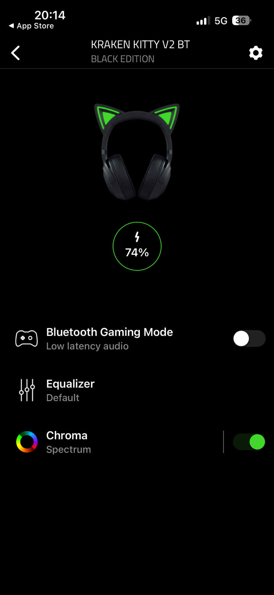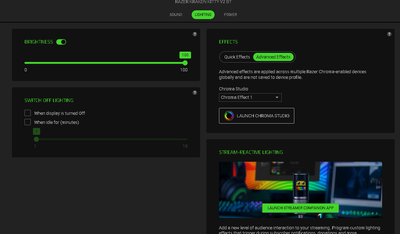 W zależności od platformy, słuchawki Kraken Kitty V2 BT są obsługiwane przez różne aplikacje. W przypadku telefonów będzie to Razer Audio, która pełni również funkcję personalizacji oświetlenia. Jest to nowa zmiana, bowiem jeszcze do niedawna model Kraken Kitty V2 BT do zabawy podświetleniem RGB używał osobnej aplikacji Chroma RGB. Wracając do Razer Audio, software zawiera equalizer do zmieniania tonów dźwięku (dostępna jest m.in. opcja podkręcenia basu) oraz tryb Bluetooth Gaming Mode, zapewniający mniejsze opóźnienie dźwięku podczas gry poprzez aktywację niższej latencji połączenia Bluetooth.
