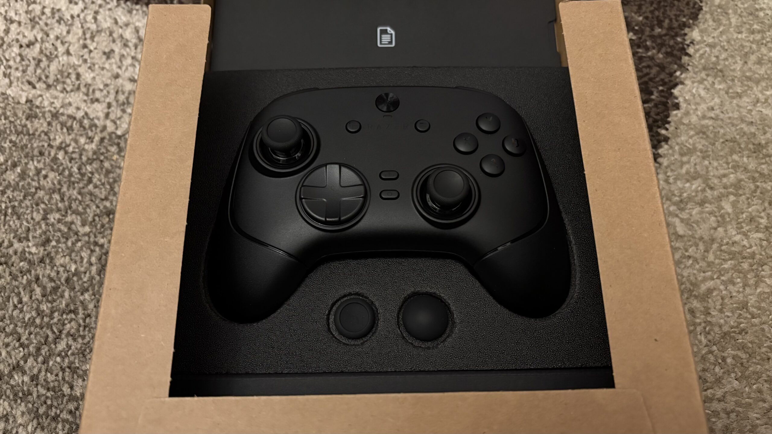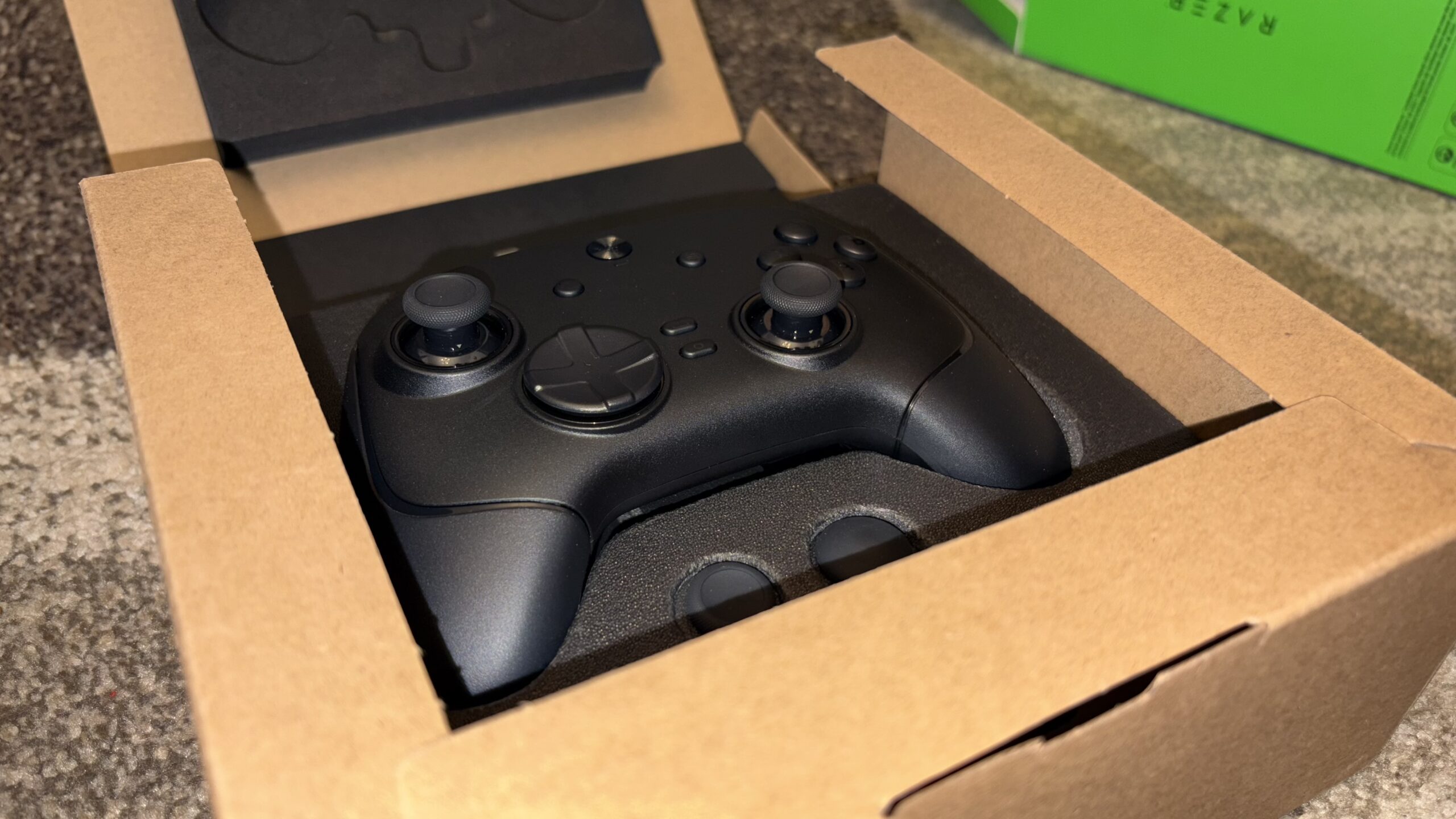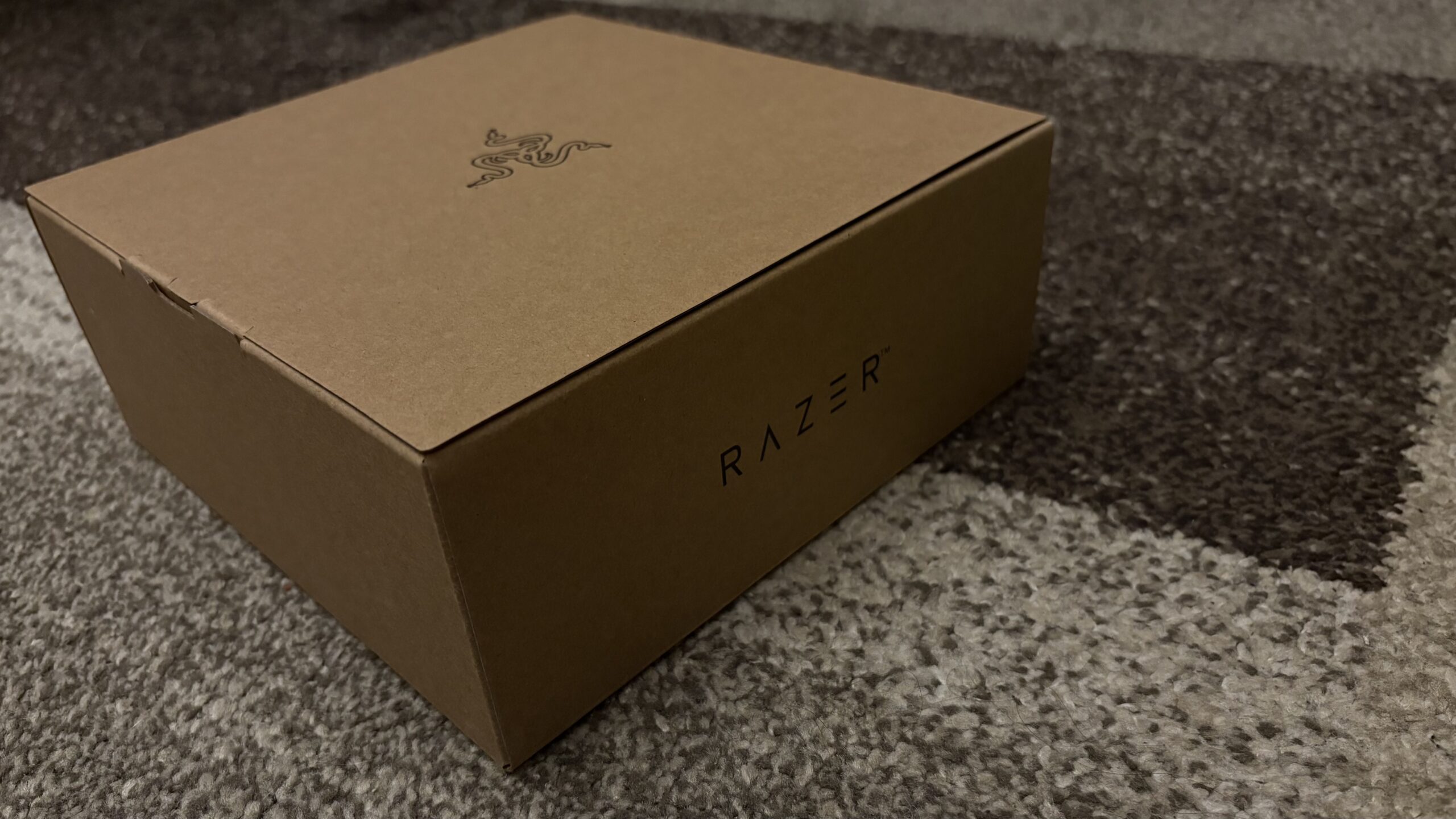 Dostępu do pudełka strzeże plaster taśmy o wymiarach 6×4 cm. Pudełko wydaje się być skrojonym wymiarowo na potrzeby samego urządzenia i jest niewielkich rozmiarów. Tuż po odklejeniu taśmy wewnątrz zastajemy jeszcze jeden karton. Jak na markę najwyższych lotów przystało – bez rozwiązania w postaci double boxa nie mogło się objeść. Na samej jego górze znajduje się logo Razera, z kolei po bokach umiejscowione są napisy brandu. Od ujrzenia kontrolera dzieli nas już tylko wyciągnięcie zakładki i… jest! Danie główne mieści się w wytłoczonej, wgłębionej piance. Ta została również umieszczona od wewnętrznej części klapy. Transportujcie, gdzie tylko chcecie i w jakich warunkach chcecie – obaw o to, że pad się przemieści, mieć nie można.