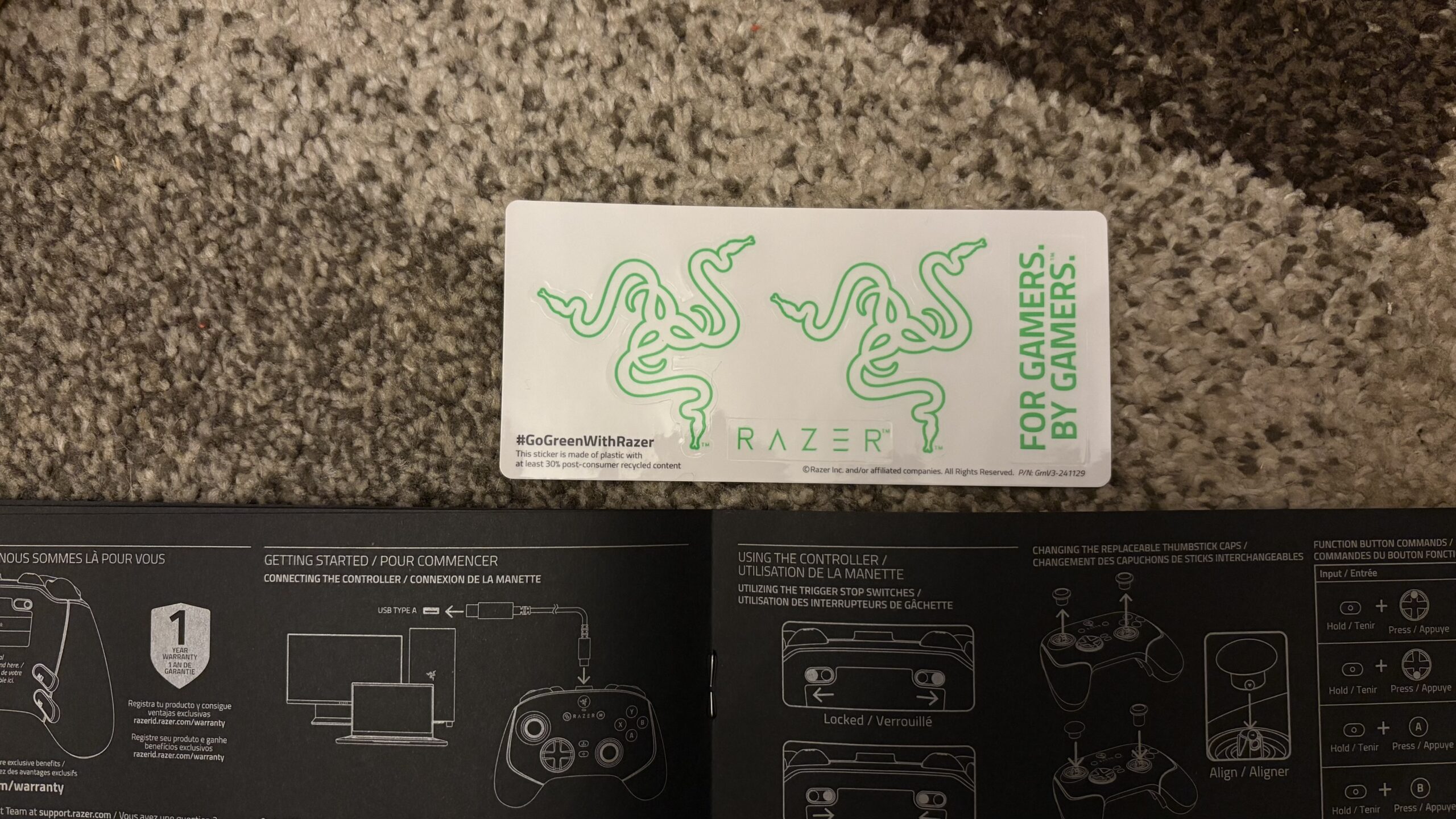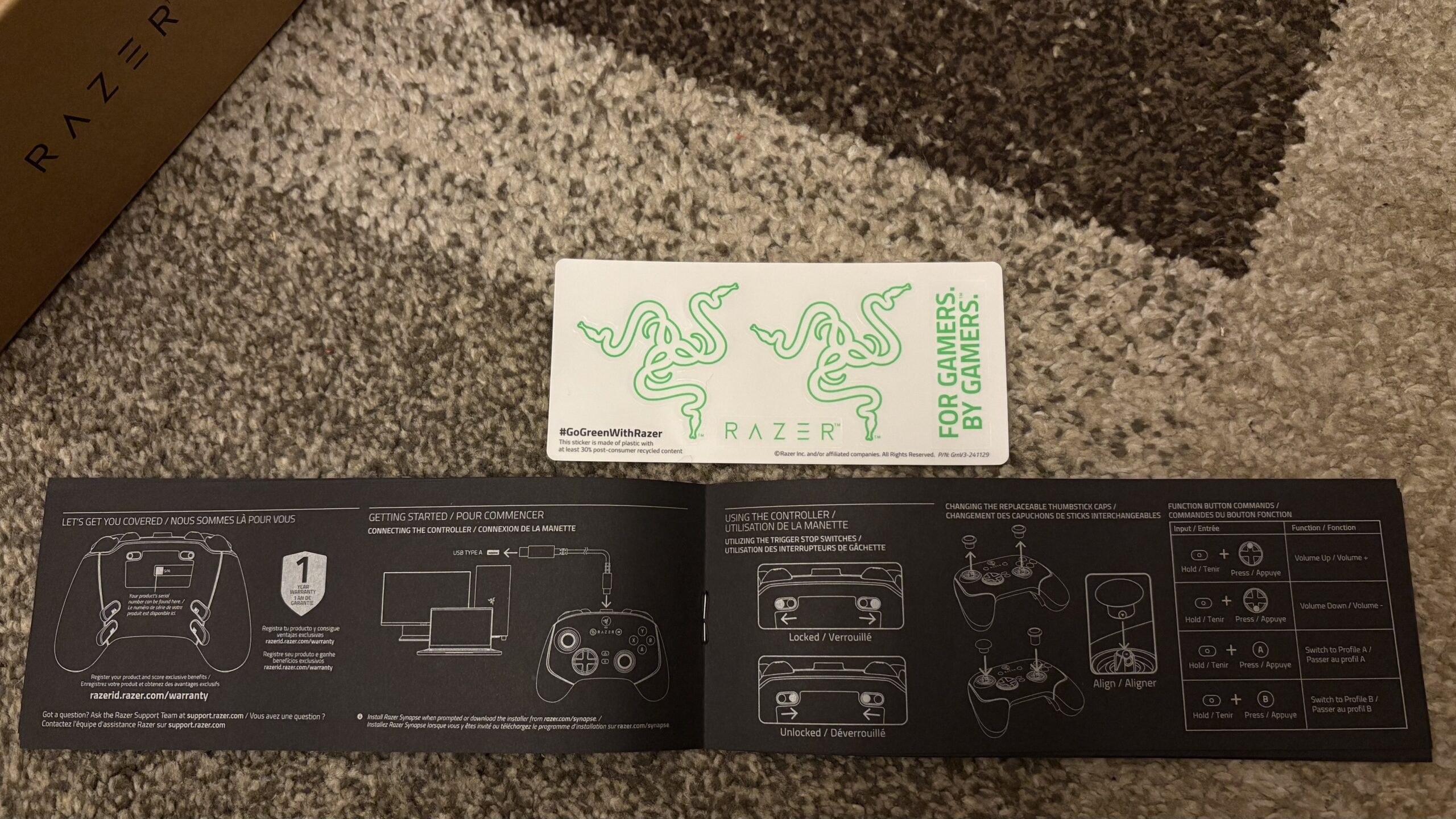 Jak zwykle uśmiech na twarzy wywołuje dołączony zestaw wlepek od Razera. To zasadniczo żaden dodatkowy koszt, a jednak po częstokroć spotkać się można z wykorzystywaniem naklejek przez posiadaczy konkretnych sprzętów. Fajnie, że marka zza oceanu nie poprzestaje w tej materii. To również nieco powielenie sekcji unboxingu, niemniej jednak jestem zwolennikiem pakowania peryferiów do double boxa i tak też jest w tym przypadku. Gdyby rozpatrywać otoczkę – jest naprawdę konkretnie! Kontroler waży niespełna 200 gramów i dobrze trzyma się go tuż po wyjęciu z opakowania za pierwszym razem. Nie za ciężki, nie za lekki – sprawiający wrażenie „pustego”. Razer postarał się wyważyć gramaturę, a to w konsekwencji powinno przełożyć się na komfort użytkowania przy okazji dłuższych sesji. Szybkie „obcykanie” przycisków oraz gałek. Te drugie chodzą bardzo płynnie, bez oporów z bardzo szybkim czasem reakcji.