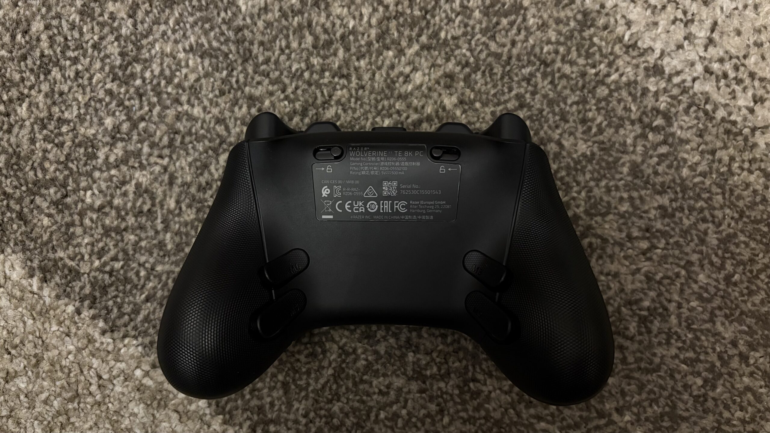 Główną, górną część pada od łopatek oddzielają jeszcze stylowe, wygładzone paski z minimalnie jeszcze ciemniejszym odcieniem czarnego. Na odwrocie kontrolera są również wyłączniki zatrzymujące spust. Służą one wymianie nakładek na gałkach.
