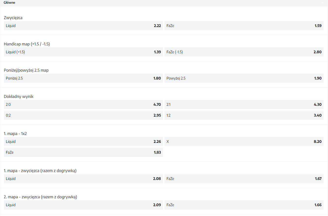 Ostatnią partię czwartkowych potyczek przewidziano na godzinę 19:30. Będzie to jednocześnie rozpoczęcie rywalizacji w zbiorze B. Na pierwszy ogień pójdzie Team Liquid, który spotka się z FaZe Clanem. Amerykańsko-francuski kolektyw nie ma za sobą dobrego startu w 2022 roku, ponieważ zajął 10-12. miejsce na BLAST Premier Spring Groups. Z kolei Finn “karrigan” Andersen i jego koledzy na tym samym turnieju zajęli 1-3. pozycję. Do tego dziewiąta siła świata rywalizowała w Play-Inach i pokonała Sprout oraz MOUZ. Obie drużyny grały przeciwko sobie już dwukrotnie w tym roku na wcześniej wspomnianych zawodach. W potyczkach BO1 dwukrotnie lepsi byli reprezentanci FaZe. W przypadku postawienia na Team Liquid i zwycięstwa tej drużyny – każda złotówka zostanie pomnożona razy 2.22. Gdy jednak postawimy na FaZe i też ten zespół okaże się lepszy – złotówka zostanie pomnożona x 1.59.