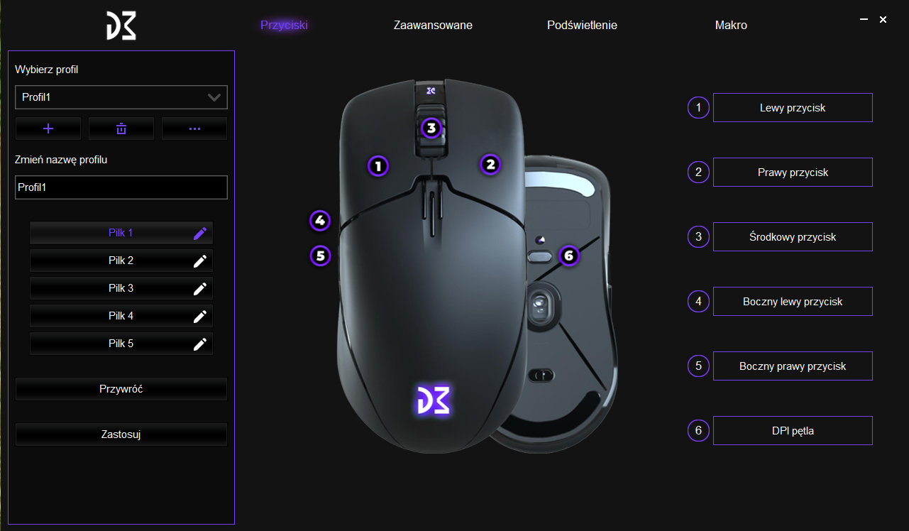 Program do DM7 Switch zawiera wszystko, czego potrzeba. Na samym początku zastajemy cztery zakładki: Przyciski, Zaawansowane, Podświetlenie oraz Makro.