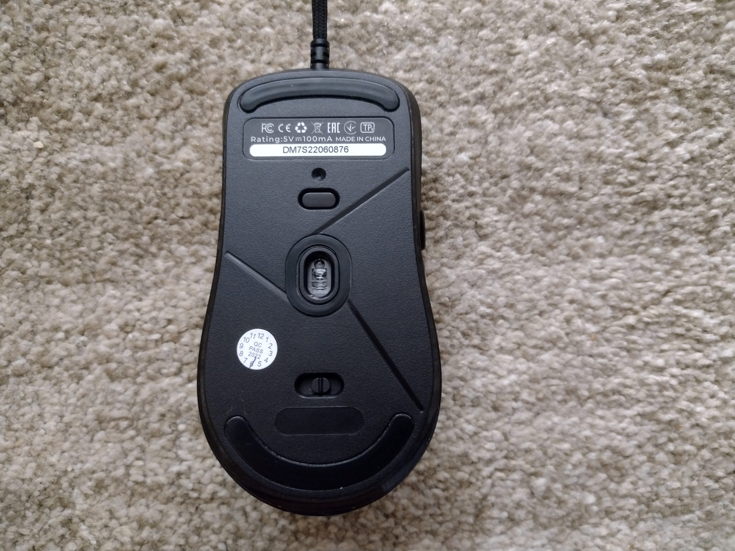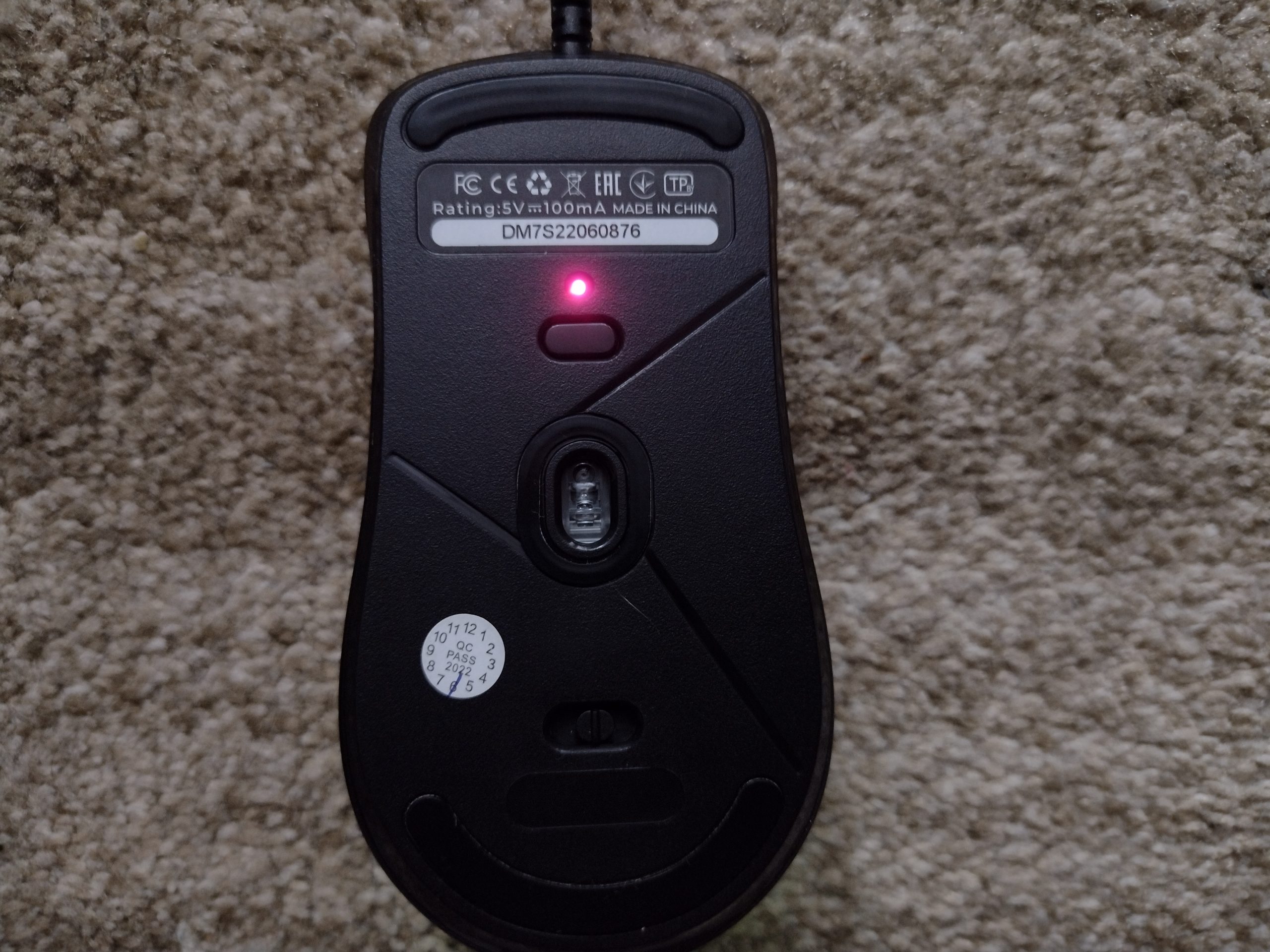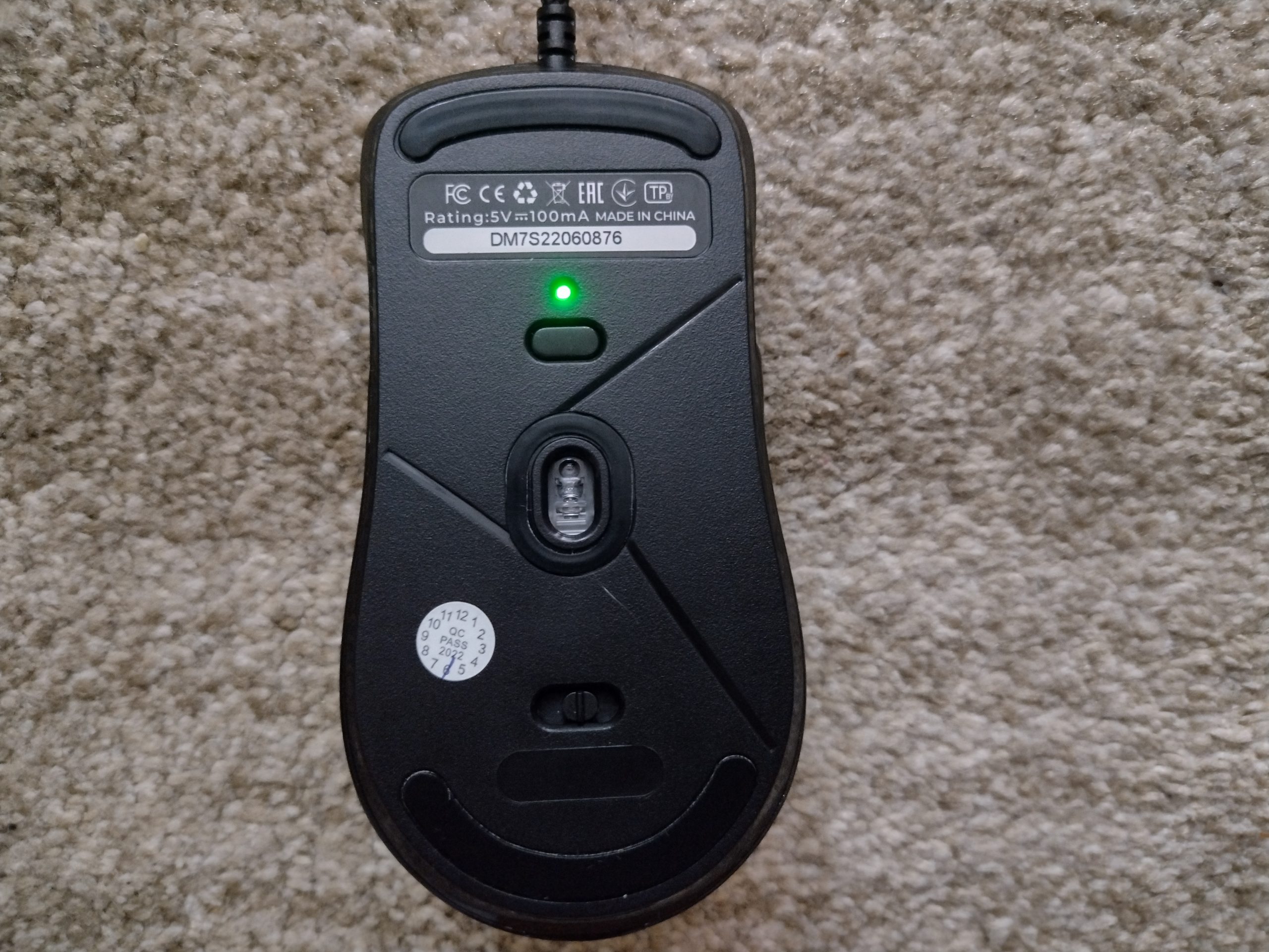 Pod spodem nie mogło zabraknąć sensora oraz naklejki technicznej. W przypadku DM7 Switch jest nieco ciekawiej względem klasycznych rozwiązań, ponieważ przycisk od zmiany DPI został umiejscowiony właśnie na spodzie, a nie na górze jak ma to miejsce zazwyczaj. Tuż nad nim jest mała dioda, która kolorami informuje nas o ustawionej rozdzielczości. Jest jeszcze przełącznik do ustawienia szybkości raportowania. Nie obyło się bez ślizgaczy. Są to dwie teflonowe, cienkie przestrzenie zarówno z dołu, jak i góry.