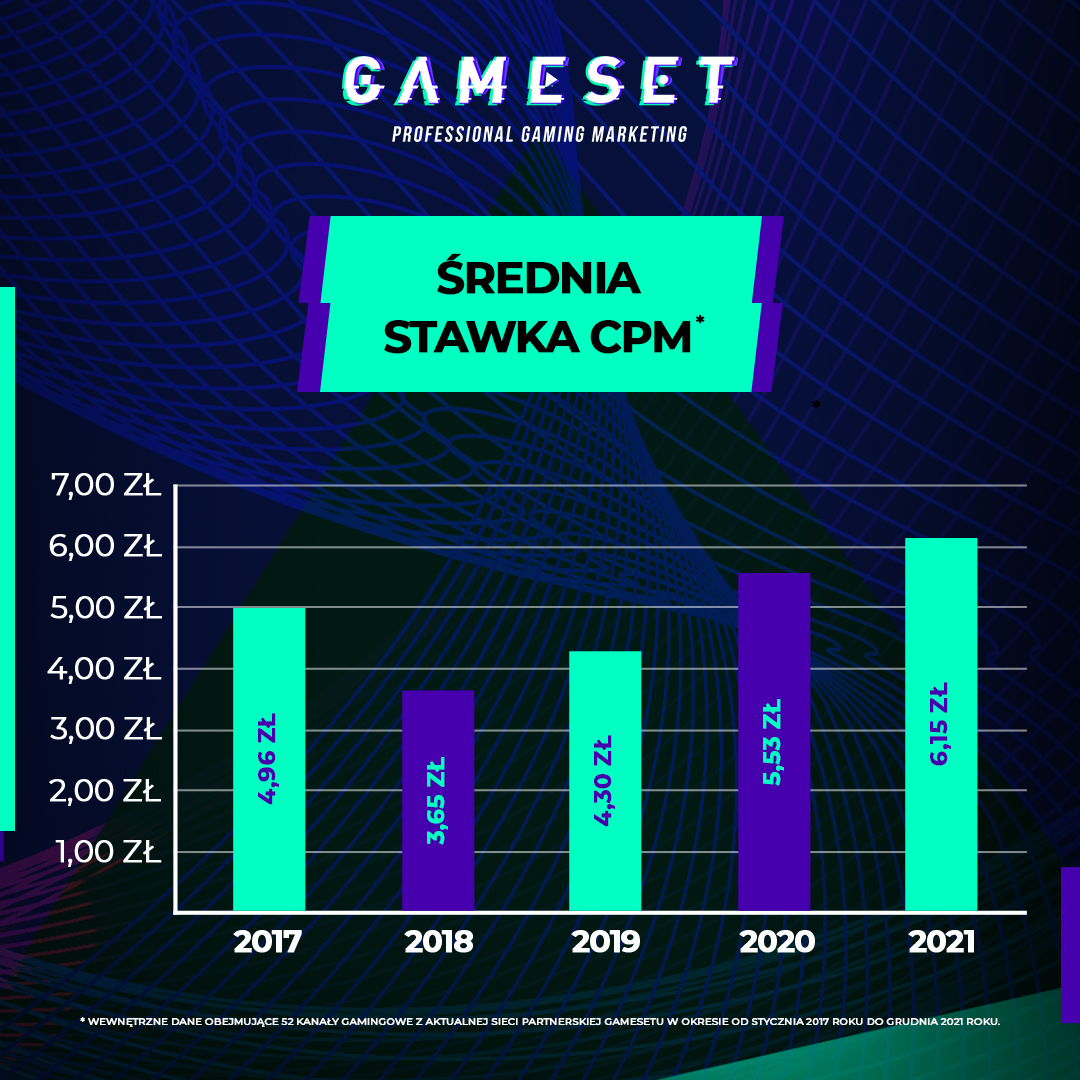 W 2017 roku średnia stawka CPM dla przeciętnego kanału gamingowego z sieci partnerskiej Gamesetu wynosiła 4,96. Trzy lata później, bo w 2020 roku koszt, jaki za 1000 wyświetleń reklamy musiał ponieść pracodawca na takim kanale, wzrósł do 5,53 PLN. Rok później, czyli w 2021 roku było to już 6, 15 zł. Tak więc w ciągu pięciu lat stawka uległa zwiększeniu o 24%.